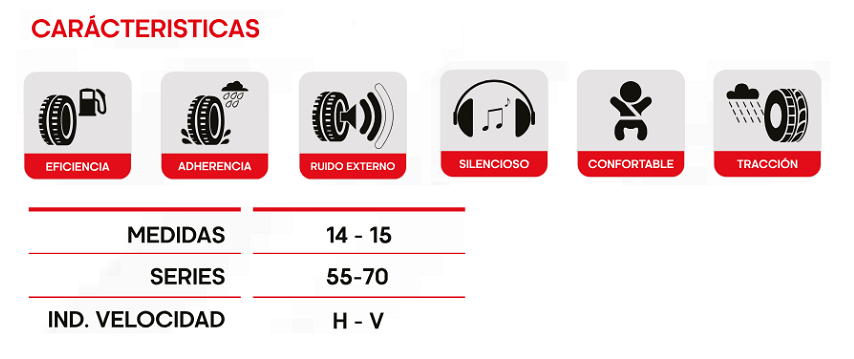 Neumático 195/60 R15 diseñado para ofrecer buen equilibrio entre agarre, confort y durabilidad. Su perfil proporciona estabilidad en ruta y manejo seguro en ciudad, siendo una opción confiable para autos de uso diario que buscan rendimiento y eficiencia en cada trayecto.